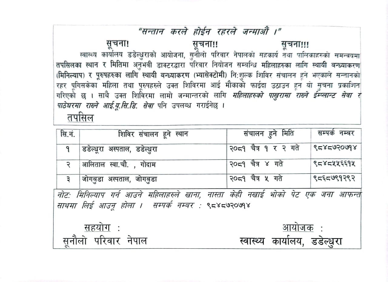 स्वास्थ्य कार्यालय डडेल्धुराको सहकार्यमा सञ्चालन हुन लागेको यो शिविरमा सुनौलो परिवार नियोजन नेपालले पनि साथ दिएको छ।