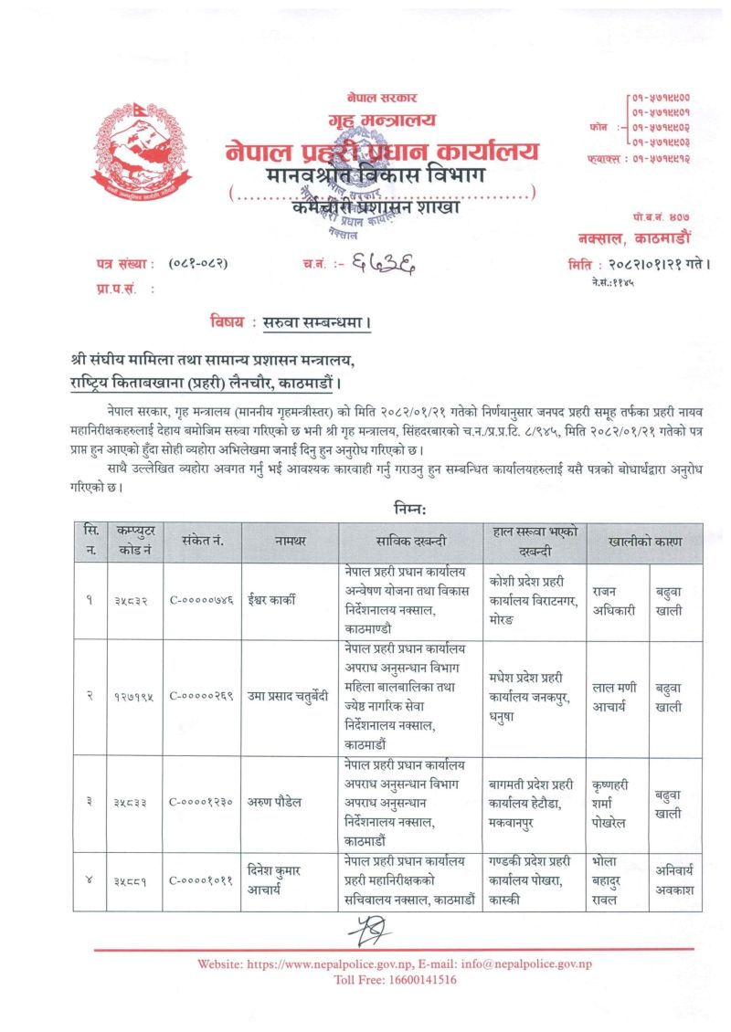 कोशी प्रदेशमा ईश्वर कार्की, मधेसमा उमाप्रसाद चतुर्वेदी, बागमतीमा अरुण पौडेल, गण्डकीमा दिनेश आचार्य, लुम्बिनीमा राजेन्द्र भट्टको सरुवा भएको छ।