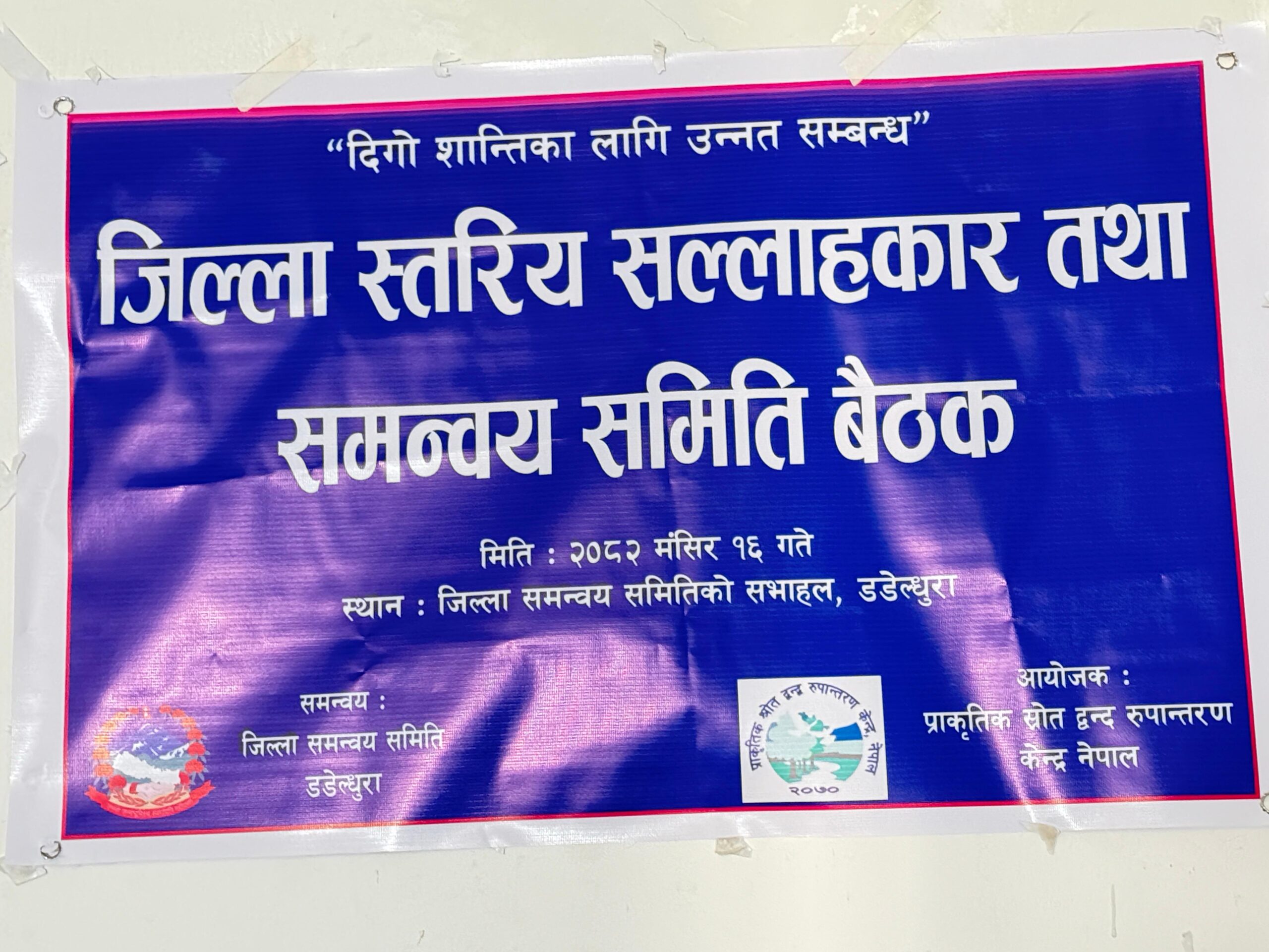 डडेल्धुरा : प्राकृतिक स्रोत द्वन्द्व रुपान्तरण केन्द्र नेपालको जिल्ला स्तरीय समन्वय तथा सल्लाहकार समितिको बैठक जिल्ला समन्वय समिति डडेल्धुरामा सम्पन्न भएको छ।